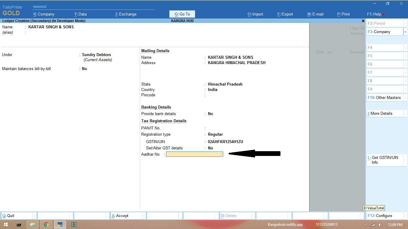 How To Add Aadhar Number in Customer Details in Tally Prime,