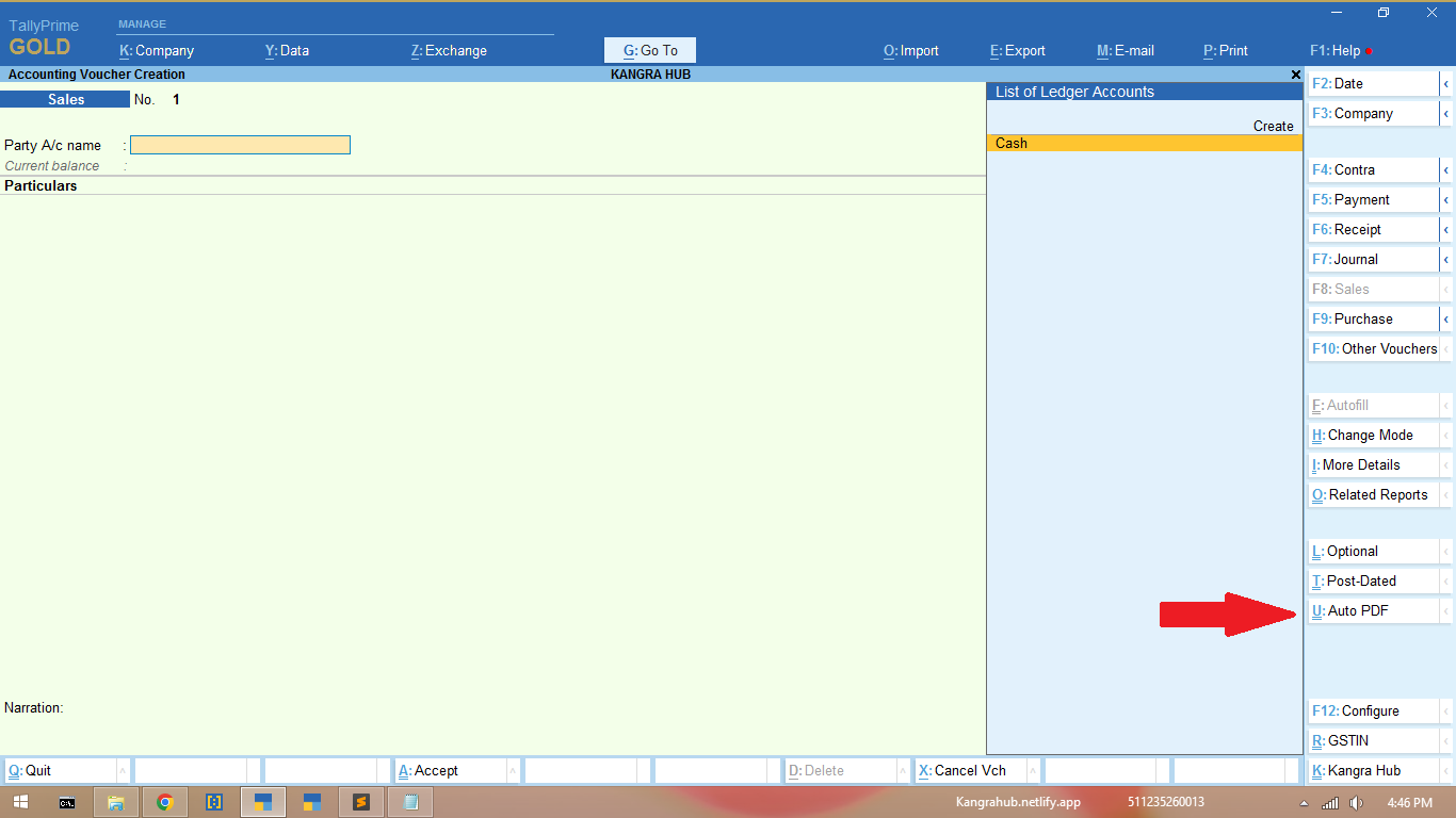 [#Form:Sales Color] Add:Button:Invpdf On:Form Accept:Yes:Call:KangraHubPdf [Button:Invpdf] Title:"Auto PDF" Key:Ctrl + U Action:Call:KangraHubPdf [Function:KangraHubPdf] Variable:SavePDF:String Local Formula:KHInvNo:$ $StringFindAndReplace:$VoucherNumber:"/":"-" Local Formula:KHLedger:$ $StringFindAndReplace:$PartyLedgerName:"\":"-" Local Formula:KHDate:$$String:$Date 10:Set:SavePDF:$$String:"D:\KANGRA HUB HELP\kangra hub\input"+"/"+@KHInvNo +"_"+@KHLedger+"_"+@KHDate 20:Set:SVExportFormat:$SysName:PDF 30:Set:SVPrinterName:"Adobe PDF" 40:Set:SVPrintFileName:$ $MakeExportName:##SavePDF:##SVExportFormat 50:Set:SVOPenfileAfterExport:No 60:Export Report:.:True
